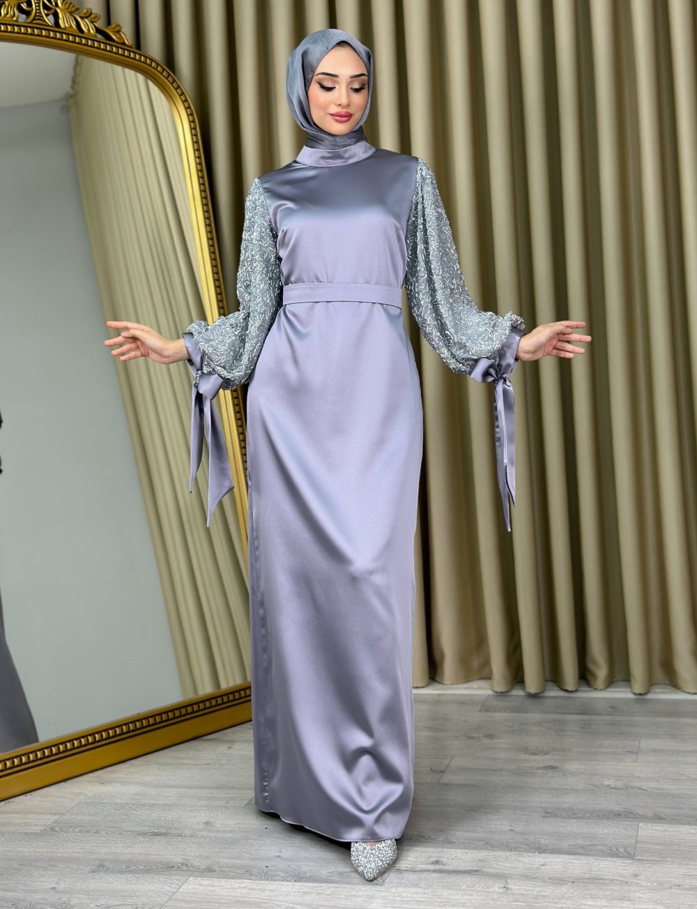 Ürün açıklama; Kolları boncuk detaylıdır, yapıştırma değildir dökülme yapmaz. Kendi kumaşından kuşağı mevcuttur, kolları fiyonk detaylıdır.