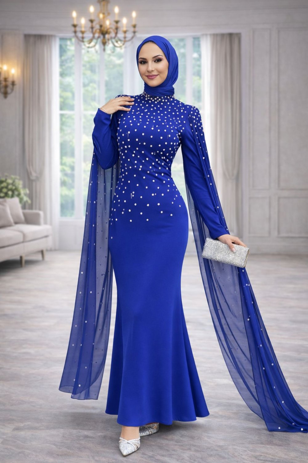 Defne Tesettür Abiye Saks Mavisi