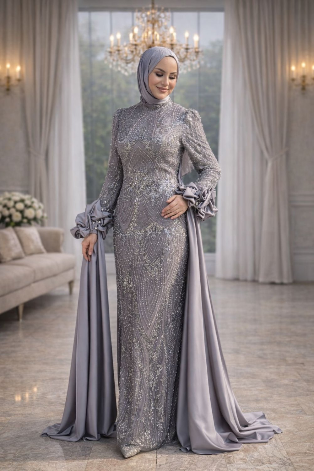 Işıltılı özel işleme detayları ve akışkan pelerin formu ile davetlerin en iddialı tasarımı.
