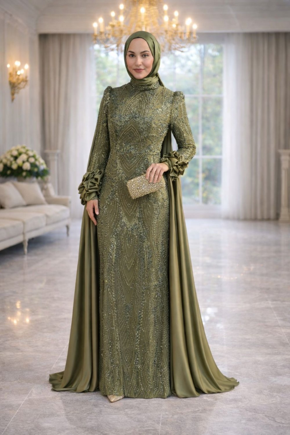 Işıltılı özel işleme detayları ve akışkan pelerin formu ile davetlerin en iddialı tasarımı.