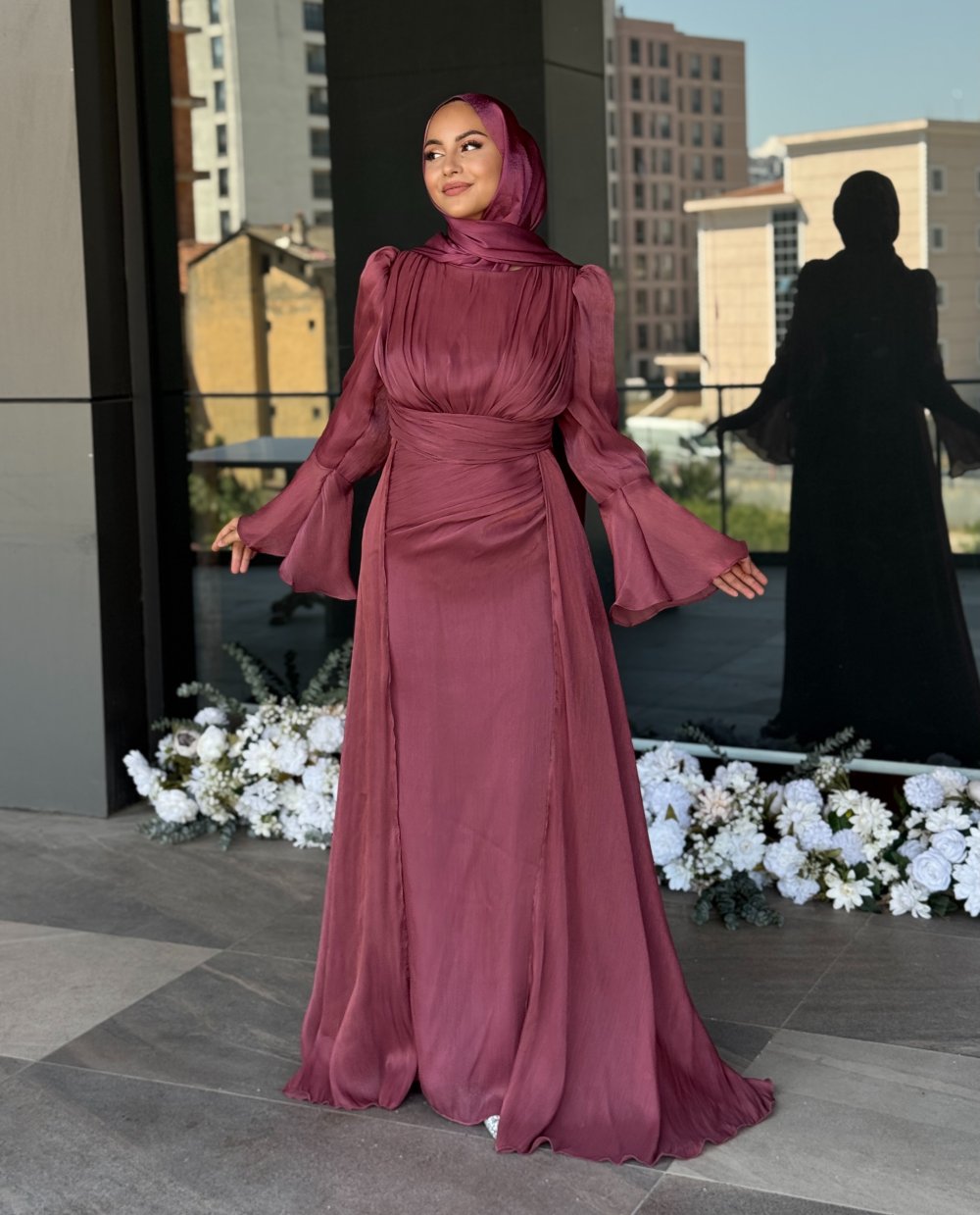 Sıfır yaka, uzun kollu, kol ucu volanlı, omuzları büzgülü , drape detaylı,