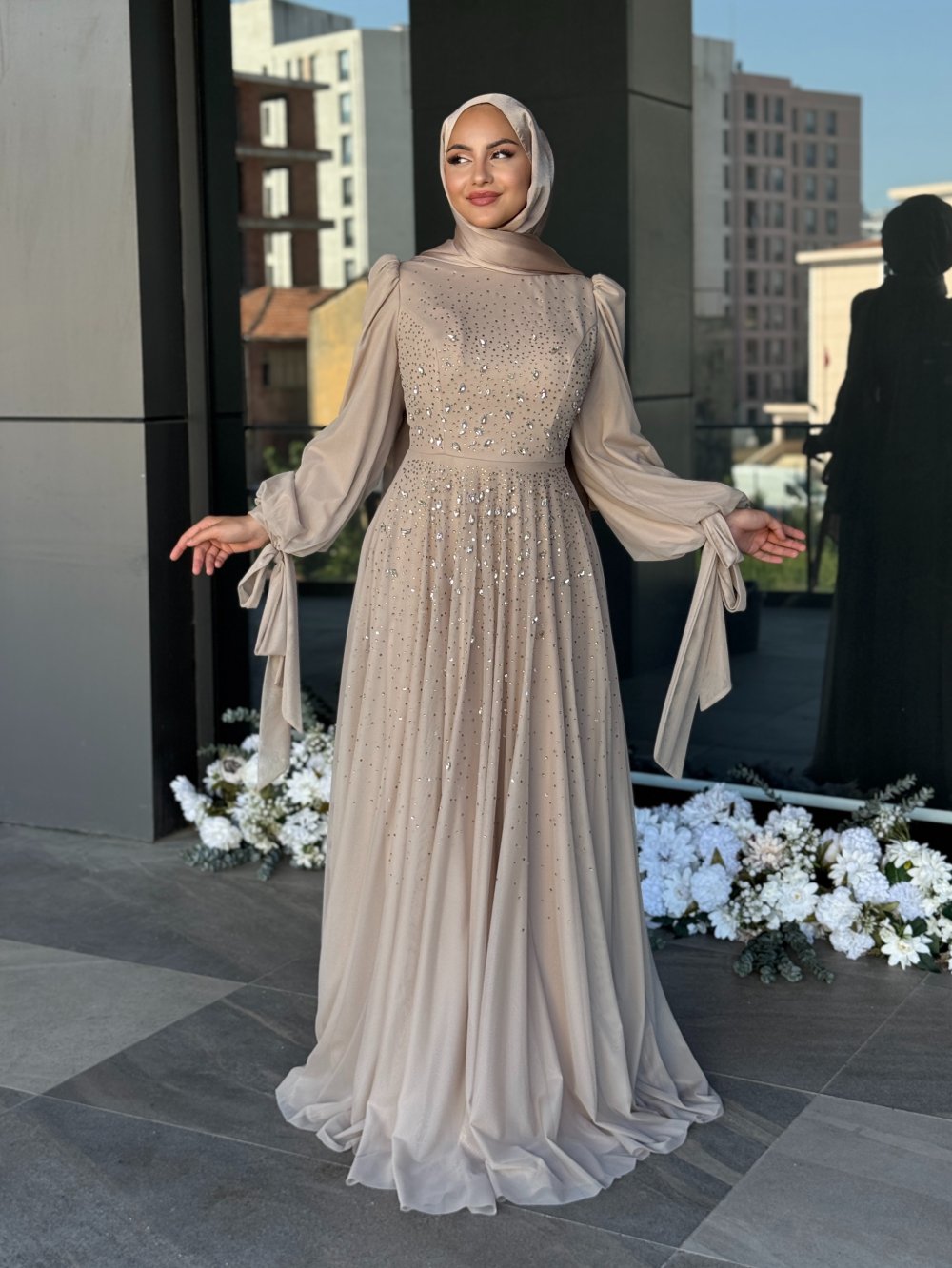 Zarif tasarımıyla dikkat çeken bu elbise, 160 cm boyu ve üzerindeki taş detayları ile şıklığınızı ön plana çıkarır. Kollarındaki fiyonk bağlama detayı feminen bir dokunuş katarken, arkadan fermuarlı yapısı pratik giyim imkânı sunar. Özel günleriniz için ideal bir tercihtir.