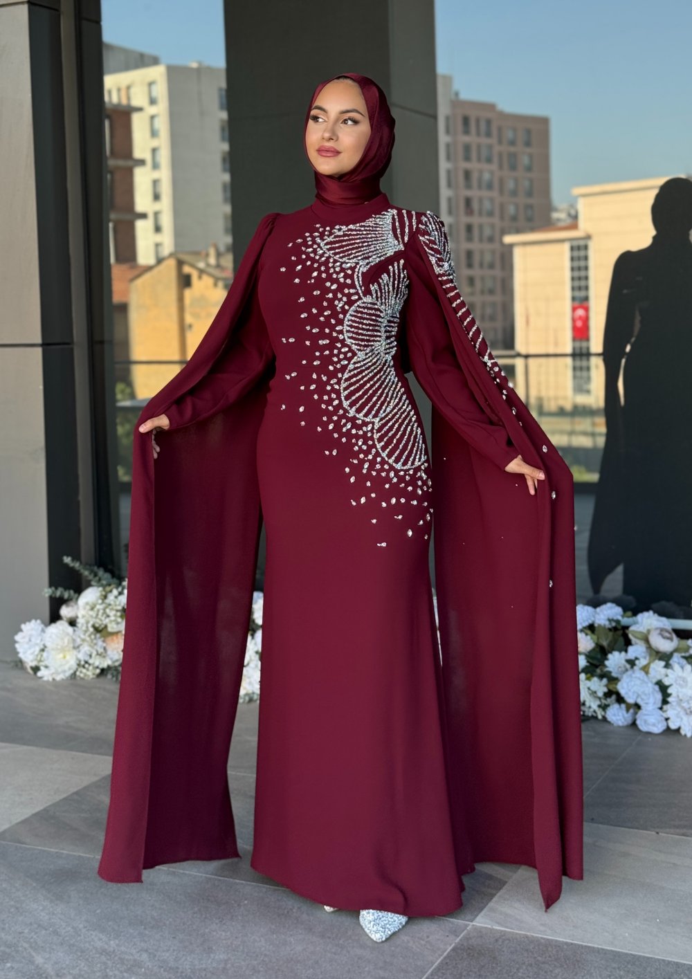 ✔️ Drapeli pelerin kollar, elbiseye asil bir hava katarken hareketinize zarafet katar.