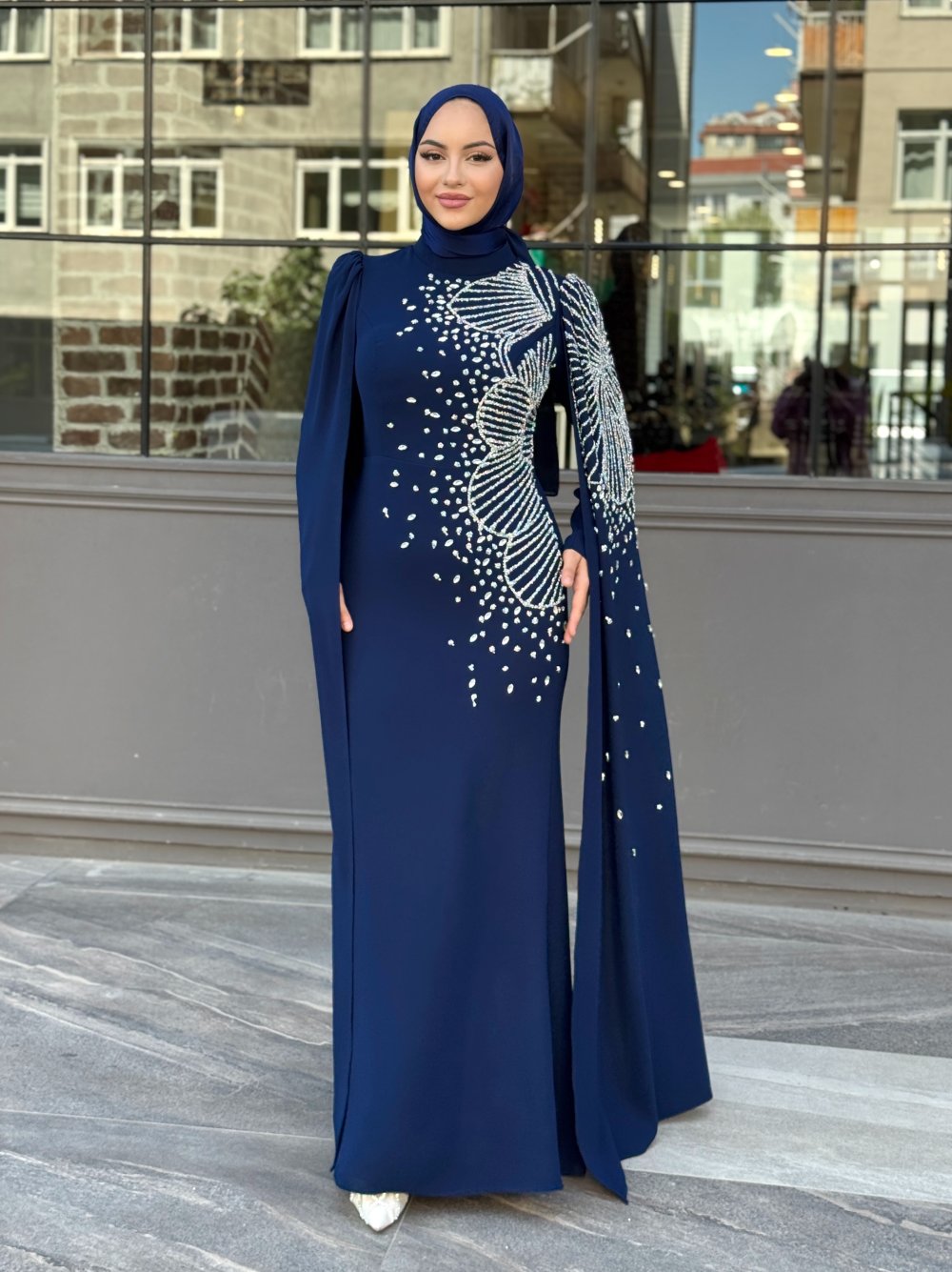 Zarafetin ve asaletin buluştuğu bu özel tasarım abiye, modern çizgileri ve göz alıcı taş işlemeleriyle fark yaratıyor.