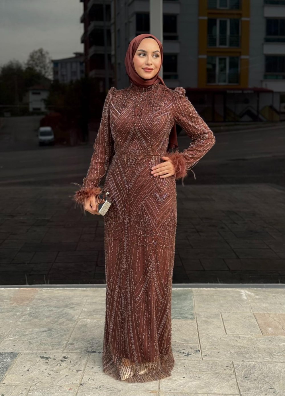 • Uzun kollu tasarım, kol uçlarında zarif tüy detayları